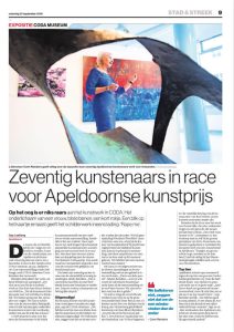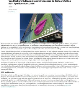 Het auditorium van het CODA museum was gisteren (8 december) de plek waar de eerste van Reekum Cultuurprijs werd uitgereikt aan beeldend kunstenaar Marije Vermeulen. Als een van de vier genomineerden werd haar deze prijs toegekend. Ze was zichtbaar verrast en beduusd en kon weinig anders uitbrengen dan ,,Bedankt”.
